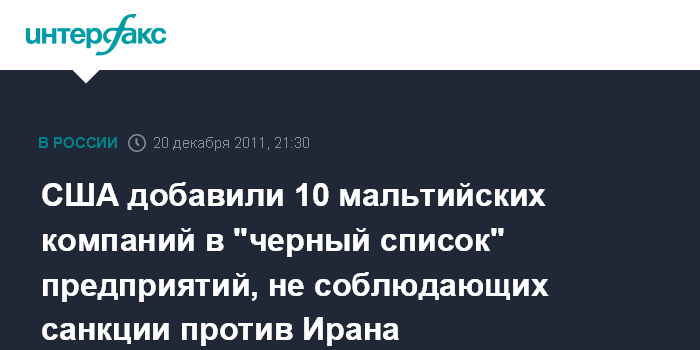 Вашингтон. 20 декабря. INTERFAX.RU - США добавили 10 подставных судоходных компаний и одного предпринимателя, базирующихся на Мальте, в "черный список" предприятий и граждан, не соблюдающих санкции ООН в отношении Ирана, сообщили во вторник в американском министерстве финансов.