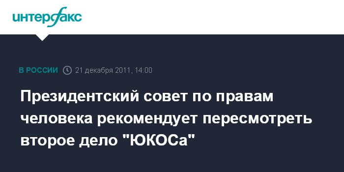 Москва. 21 декабря. INTERFAX.RU - Президентский совет по правам человека предлагает Следственному комитету изучить основания для пересмотра второго уголовного дела по "ЮКОСу".