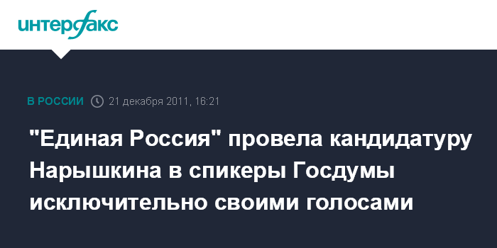 Москва. 21 декабря. INTERFAX.RU - Фракция "Единой России" воспользовалась своим правом парламентского большинства на первом же заседании новой Госдумы, поскольку кандидат от этой фракции Сергей Нарышкин был избран на пост спикера голосами исключительно депутатов от "Единой России".