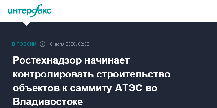 Хабаровск. 18 июля. ИНТЕРФАКС-ДАЛЬНИЙ ВОСТОК - Ростехнадзор готов к осуществлению надзора над строительством объектов к саммиту АТЭС, который пройдет во Владивостоке в 2012 году.