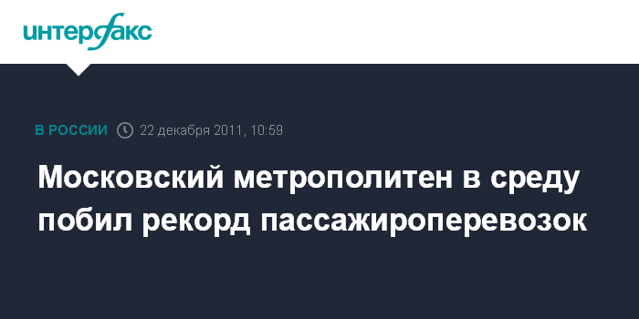 Москва. 22 декабря. INTERFAX.RU - В минувшую среду, 21 декабря, впервые в 2011 году столичный метрополитен перевез 9,2 млн пассажиров, заявил глава московского метрополитена Иван Беседин на пресс-конференции в центральном офисе "Интерфакса" в четверг.