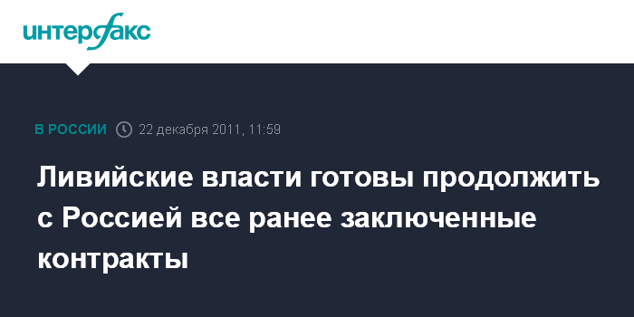 Москва. 22 декабря. INTERFAX.RU - Ливийские власти подтвердили готовность продолжить сотрудничество с российскими компаниями по всем заключенным ранее контрактам и действующим проектам, сообщил спецпредставитель президента РФ по Африке сенатор Михаил Маргелов.