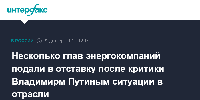 Несколько глав энергокомпаний подали в отставку после критики Владимирм Путиным ситуации в отрасли