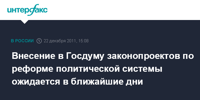 Москва. 22 декабря. INTERFAX.RU - Законопроекты по реформе политической системы будут внесены в Госдуму в ближайшие дни, сообщил помощник президента РФ Аркадий Дворкович.