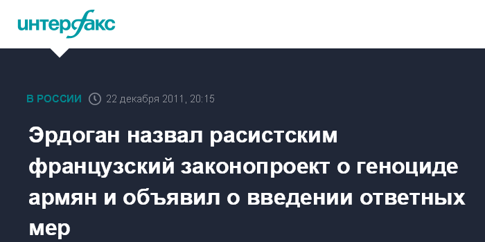Стамбул. 22 декабря. INTERFAX.RU - Премьер-министр Турции Реджеп Тайип Эрдоган жестко раскритиковал решение нижней палаты парламента Франции одобрить законопроект о признании преступлением факта отрицания геноцида армян, передают в четверг западные СМИ.