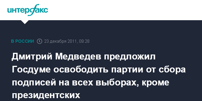 Москва. 23 декабря. INTERFAX.RU - Президент Дмитрий Медведев внес в Госдуму проект федерального закона "О внесении изменений в отдельные законодательные акты РФ в связи с освобождением политических партий от сбора подписей избирателей на выборах депутатов Госдумы, в органы государственной власти субъектов РФ и органы местного самоуправления".