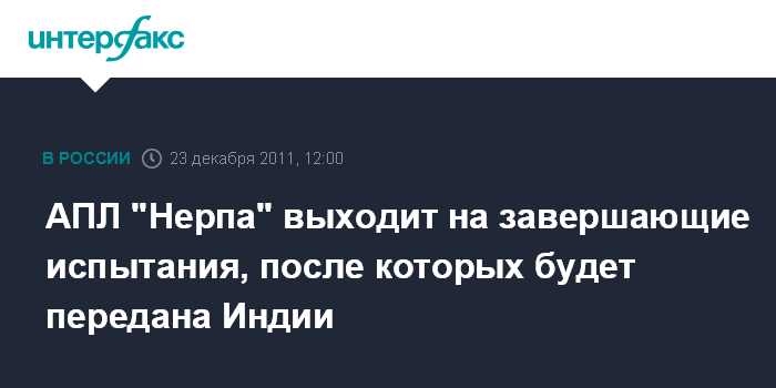 Москва. 23 декабря. INTERFAX.RU - Передача атомной подводной лодки (АПЛ) "Нерпа" в лизинг индийским Военно-морским силам запланирована на 28 декабря 2011 года, сообщил "Интерфаксу-АВН" в пятницу источник, знакомый с ситуацией.