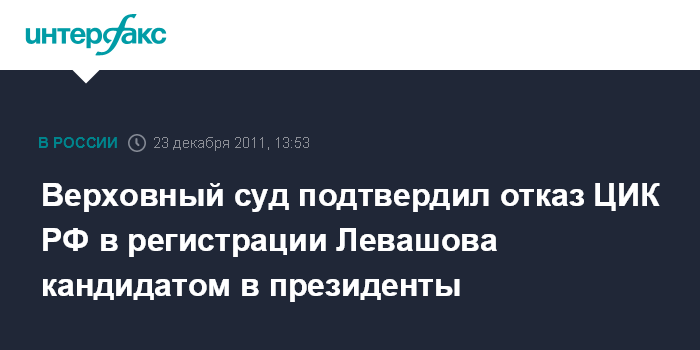 Москва. 23 декабря. INTERFAX.RU - Верховный суд РФ признал законным отказ Центральной избирательной комиссии зарегистрировать в качестве кандидата в президенты России писателя и публициста Николая Левашова.