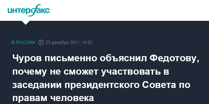 Москва. 23 декабря. INTERFAX.RU - Глава Центризбиркома РФ Владимир Чуров официально уведомил президентский Совет по правам человека о том, что он не сможет принять участия в заседании совета, посвященном нарушениям на последних парламентских выборах.
