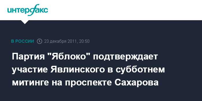 Москва. 23 декабря. INTERFAX.RU - Партия "Яблоко" примет участие в общегражданском митинге "За честные выборы", который пройдет в Москве в субботу на проспекте академика Сахарова, сообщил пресс-секретарь партии Игорь Яковлев.
