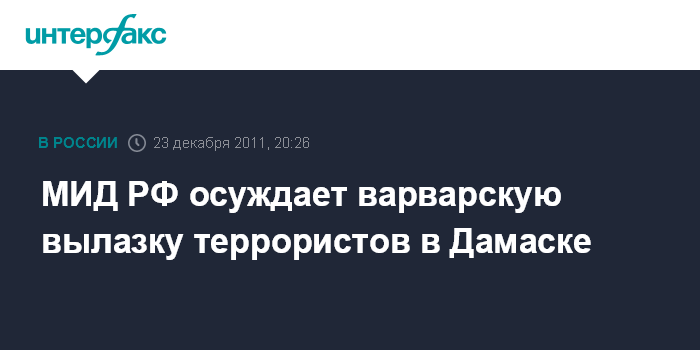 Москва. 23 декабря. INTERFAX.RU - Россия осудила теракт в Дамаске и действия экстремистских сил, разжигающих конфронтацию в Сирии.