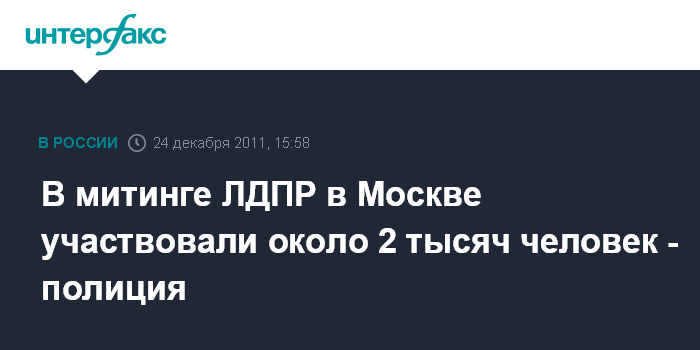 Москва. 24 декабря. INTERFAX.RU - Митинг ЛДПР на Пушкинской площади завершился без происшествий, сообщили "Интерфаксу" в пресс-службе ГУ МВД России по Москве. "В митинге, организованном партией ЛДПР на Пушкинской площади, приняло участие около 2 тыс. человек", - сказали в пресс-службе.