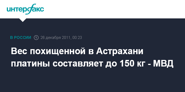 Астрахань. 26 декабря. ИНТЕФАКС-ЮГ - Вес платиновых болванок, похищенных с астраханского завода в ночь на воскресенье, составляет 100-150 килограммов, сообщил агентству "Интерфакс-Юг" официальный представитель УМВД по области Петр Русанов.