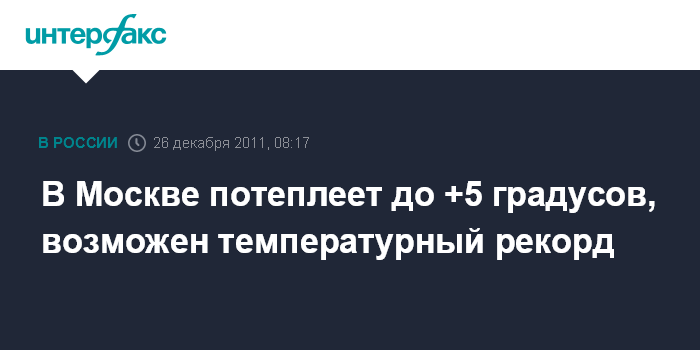 Москва. 26 декабря. INTERFAX.RU - Резкое потепление ожидается в столичном регионе в понедельник, во второй половине дня воздух в городе прогреется до плюс 3-5 градусов, сообщили "Интерфаксу" в Гидрометеобюро Москвы и Московской области.