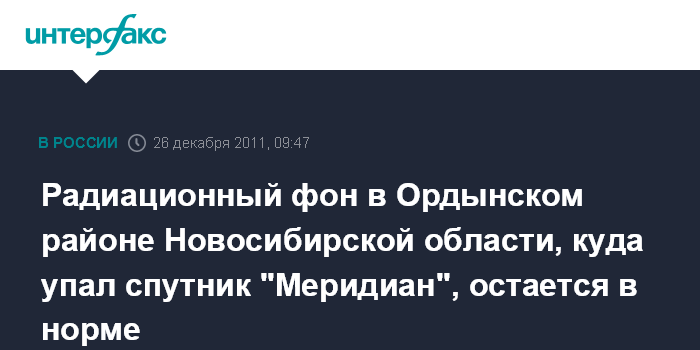 Новосибирск. 26 декабря. INTERFAX.RU - В Ордынском районе Новосибирской области, где четвертые сутки продолжают находить фрагменты рухнувшего спутника "Меридиан", радиационный фон по-прежнему в норме, сообщил агентству "Интерфакс-Сибирь" главный специалист ГО И ЧС по району Анатолий Ряснянский.