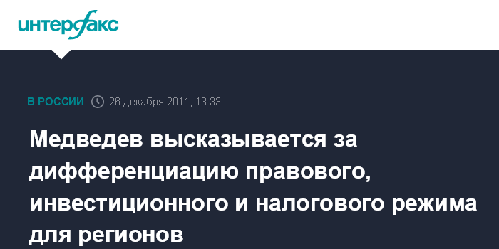 "Вообще, на мой взгляд, нам давным-давно пора признать, что Россия настолько сложна, как Федерация, что мы не должны стесняться учитывать эти различия, более тщательно создавая дифференцированные правовые, инвестиционные и, может быть, даже налоговые режимы в отдельных регионах", - сказал Д.Медведев, выступая на заседании Госсовета.