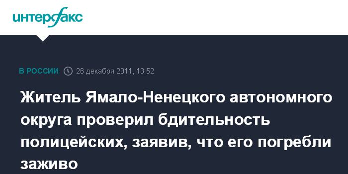 Салехард. 26 декабря. INTERFAX>RU - Наряды полиции города Нового Уренгоя были подняты по тревоге из-за сообщения местного жителя о том, что он якобы лежит в гробу и его засыпают землей, сообщила в понедельник пресс-служба УМВД по Ямало-Ненецкому автономному округу.