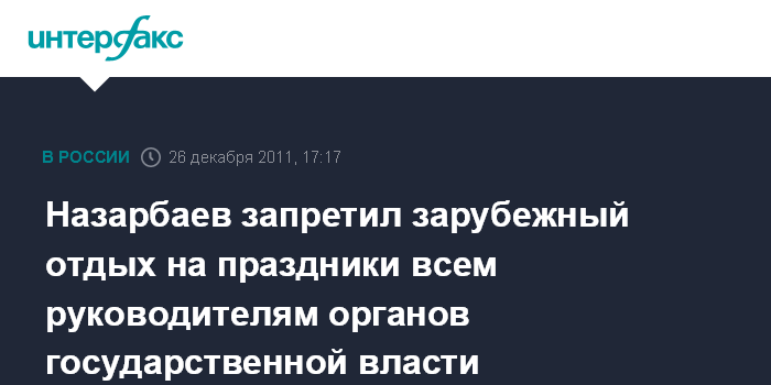 Астана. 26 декабря. INTERFAX.RU - Президент Казахстана Нурсултан Назарбаев наложил запрет на зарубежные поездки на отдых в новогодние и другие государственные праздники всем руководящим работникам правительства, министерств и ведомств, акиматов (областных администраций), сообщила пресс-служба главы государства.