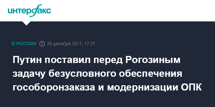 "В соответствии с принятым решением Вы будете курировать в правительстве РФ все, что связано с развитием ОПК (оборонно-промышленного комплекса). Нам нужно обеспечить безусловное исполнение гособоронзаказа", - заявил Путин.