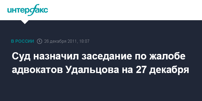Москва. 26 декабря. INTERFAX.RU - Тверской суд Москвы во вторник рассмотрит жалобу защиты оппозиционера Сергея Удальцова на его административный арест.