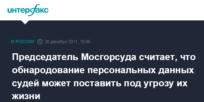 Москва. 26 декабря. INTERFAX.RU - Председатель Мосгорсуда Ольга Егорова считает недопустимым обнародование персональных данных судей, что может поставить под угрозу их жизнь.