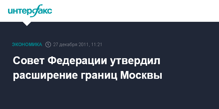 Москва. 27 декабря. INTERFAX.RU - Сенаторы на заседании во вторник расширили территорию столицы РФ за счет присоединения 148 тыс. гектаров.