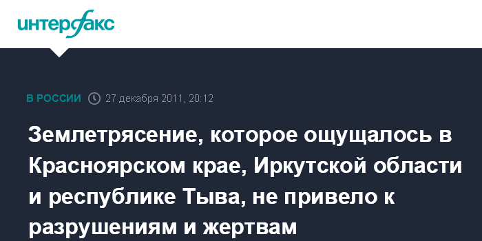 Землетрясение, которое ощущалось в Красноярском крае, Иркутской области и республике Тыва, не привело к разрушениям и жертвам