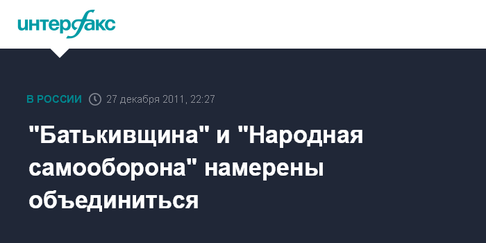 Киев. 27 декабря. INTERFAX.RU - Всеукраинское объединение "Батькивщина" и политическая партия "Народная самооборона" намерены заявить в среду об объединении. Как сообщает пресс-служба "Батькивщины", заявление будет оглашено в полдень в ее офисе в Киеве на ул. Туровской.