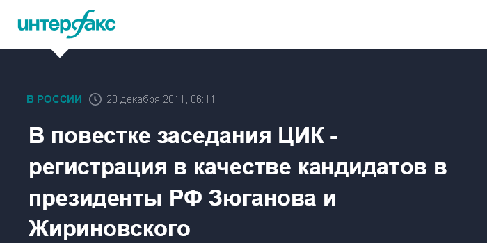 "Завтра планируется рассмотреть вопрос о регистрации Зюганова Геннадия Андреевича кандидатом в президенты Российской Федерации", - сообщил накануне журналистам секретарь Центризбиркома Николай Конкин. Н.Конкин сообщил также, что в этот же день комиссия рассмотрит вопрос о регистрации кандидатом на пост президента РФ лидера ЛДПР Владимира Жириновского.