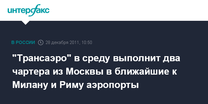 Москва. 28 декабря. INTERFAX.RU - Авиакомпания "Трансаэро" в среду выполнит два чартерных рейса из Москвы в ближайшие к Милану и Риму аэропорты, говорится в сообщении перевозчика.