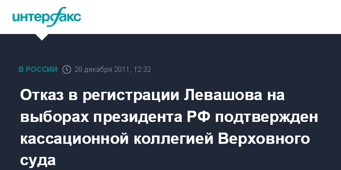 Москва. 23 декабря. INTERFAX.RU - Верховный суд РФ окончательно подтвердил законность отказа Центральной избирательной комиссии зарегистрировать в качестве кандидата в президенты России писателя и публициста Николая Левашова.