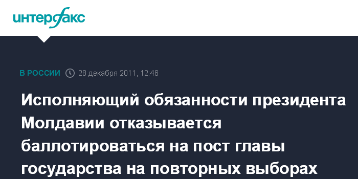 Кишинев. 28 декабря. INTERFAX.RU - Исполняющий обязанности президента Молдавии, председатель парламента, председатель Демократической партии Мариан Лупу сообщил, что не будет баллотироваться на пост президента Молдавии в повторных выборах, которые назначены на 15 января.