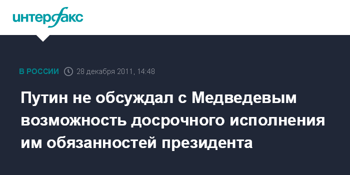 Москва. 28 декабря. INTERFAX.RU - Премьер-министр России Владимир Путин заявил, что не обсуждал с действующим президентом Дмитрием Медведевым вопрос о возможности исполнения обязанностей президента досрочно, до мартовских выборов.