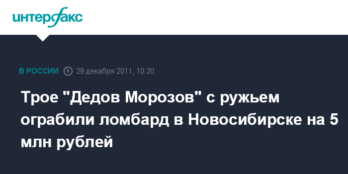 "Накануне вечером трое молодых людей в костюмах Дедов Морозов ворвались в один из ломбардов и, угрожая охотничьим ружьем, вынесли 160 наименований драгоценностей. В это время там находился хозяин, он не пострадал", - сказал представитель ГУВД.