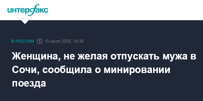 Москва. 18 июля. INTERFAX.RU - В отношении жительницы Туапсе (Краснодарский край), сообщившей о минировании электропоезда, на котором ехал ее муж, возбуждено уголовное дело.