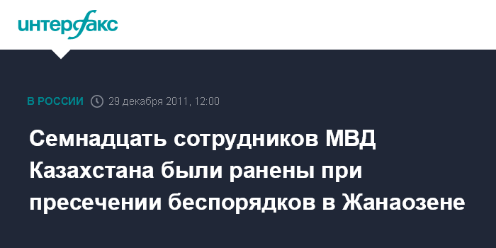 Астана. 29 декабря. INTERFAX.RU - В Жанаозене (город в Мангистауской области на западе Казахстана) при пресечении массовых беспорядков получили ранения 17 сотрудников органов внутренних дел, сообщила пресс-служба МВД республики.