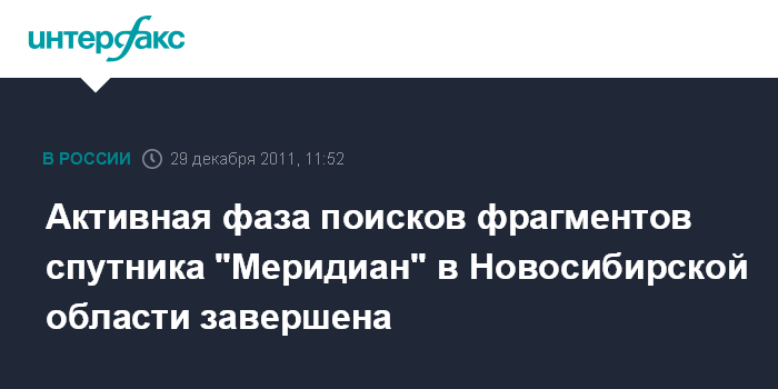 Новосибирск. 29 декабря. INTERFAX.RU - Поисковые группы, состоящие из охотников и лесников, свернули свою деятельность по поиску фрагментов спутника "Меридиан" в Новосибирской области, который рухнул в минувшую пятницу через несколько минут после запуска.