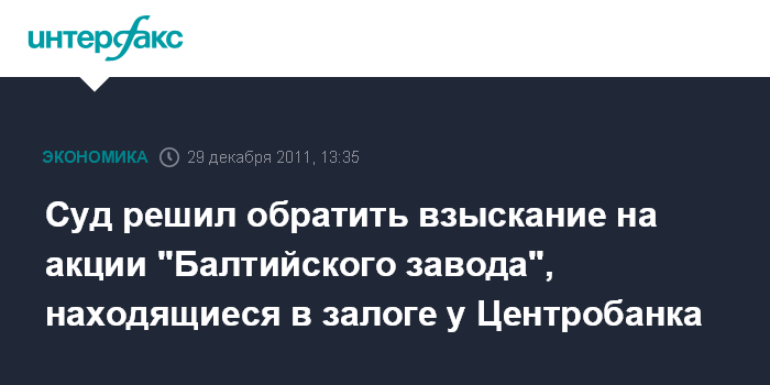 Суд решил обратить взыскание на акции "Балтийского завода", находящиеся в залоге у Центробанка