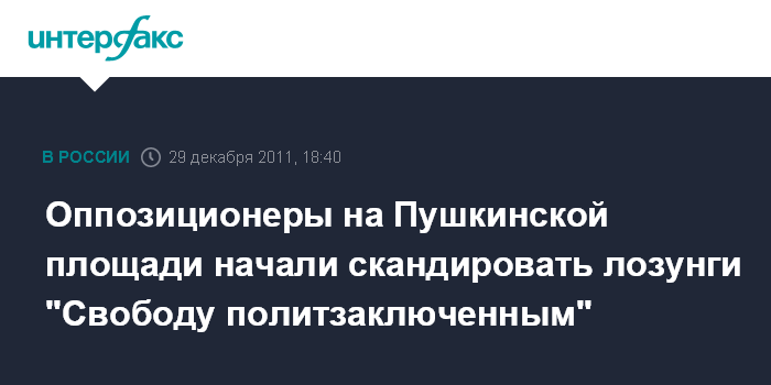 Москва. 29 декабря. INTERFAX.RU – Собравшиеся на Пушкинской площади представители оппозиции начали скандировать лозунги "Свободу политзаключенным" и "Свободу Сергею Удальцову!"