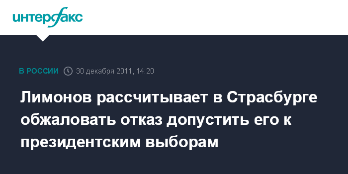 Москва. 30 декабря. INTERFAX.RU - Оппозиционер и писатель, лидер незарегистрированной партии "Другая Россия" Эдуард Лимонов заявил, что он полон решимости обжаловать в Европейском суде по правам человека в Страсбурге отказ Центризбиркома допустить его к участию в президентской кампании.