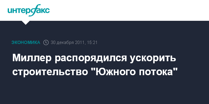Москва. 30 декабря. INTERFAX.RU - Председатель правления "Газпрома" (РТС: GAZP) Алексей Миллер после встречи с премьер-министром РФ Владимиром Путиным дал поручение профильным подразделениям концерна скорректировать планы работ по проекту "Южный поток" в целях ускорения его реализации, сообщил Агентству газовой информации (АГИ) официальный представитель "Газпрома" Сергей Куприянов.