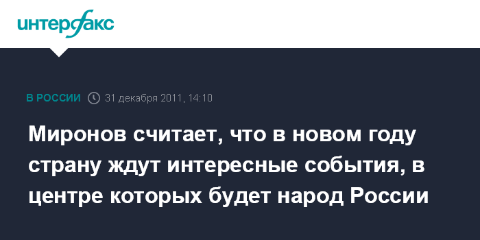 Москва. 31 декабря. INTERFAX.RU - Лидер партии "Справедливая Россия" Сергей Миронов считает, что в новом году страну ждут интересные события, в центре которых будет народ России. Как сказал "Интерфаксу" С.Миронов, возглавляющий думскую фракцию "справороссов", уходящий год граждане России отметили "вотумом недоверия власти в лице "единороссов" и проявлением своей гражданской позиции на улицах городов".