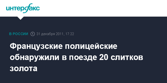Париж. 31 декабря. INTERFAX.RU - Стражи порядка Франции обнаружили в вагоне пригородного поезда к югу от Парижа 20 золотых слитков, сообщает в субботу местная газета "Паризьен".