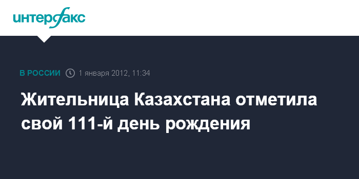 Кокшетау. 1 января. INTERFAX.RU - В первый день 2012 года исполнилось 111 лет жительнице села Красный Яр Акмолинской области Казахстана Казине-апай Исмаиловой. Долгожительница в прекрасной форме, что позволяет ей пять раз в день совершать намаз, играет на домбре, шьет.