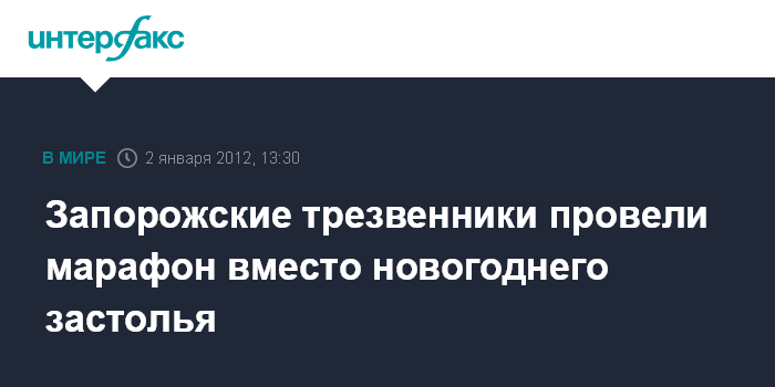 Запорожье. 2 января. INTERFAX.RU - В Запорожье в понедельник 20 сторонников трезвого образа жизни "ударили" по традиционным новогодним застольям коллективным марафоном по центральному проспекту. Как сообщили корреспонденту агентства "Интерфакс-Украина" в запорожском отделении общественного движения "Трезвая Украина", данный новогодний марафон - "это попытка сломить стереотипы общества о праздновании нового года".