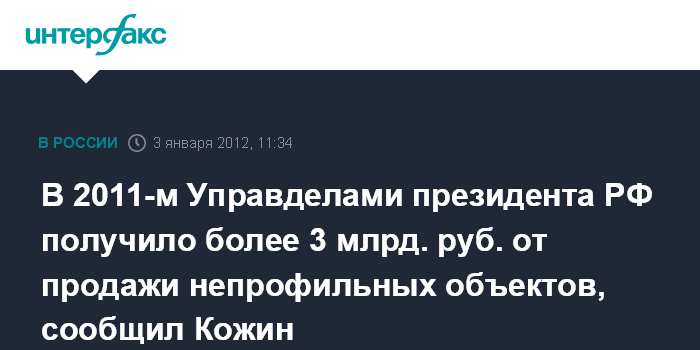 В 2011-м Управделами президента РФ получило более 3 млрд. руб. от продажи непрофильных объектов, сообщил Кожин