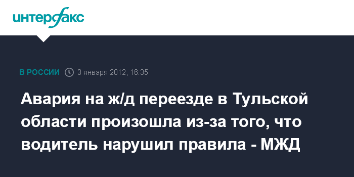 Москва. 3 января. INTERFAX.RU - Причиной аварии на железнодорожном переезде в Тульской области стало грубое нарушение водителем грузовика правил движения, сообщил "Интерфаксу" во вторник начальник службы корпоративных связей Московской железной дороги Владимир Мягков.