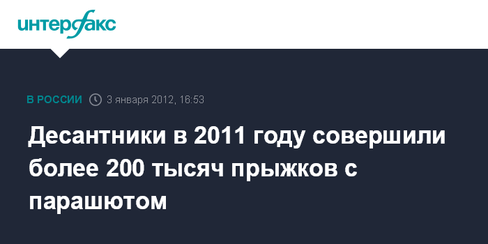 Москва. 3 января. INTERFAX.RU - Военнослужащие ВДВ в 2011 году совершили свыше 200 тыс. прыжков с парашютом, что почти на 50 тысяч прыжков больше, чем в 2010 году.