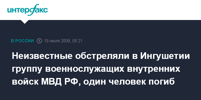 Назрань. 19 июля. ИНТЕРФАКС-ЮГ - Неизвестные обстреляли на автодороге Барсуки-Гази-Юрт колонну с военнослужащими внутренних Войск МВД России, возвращавшихся с выполнения служебного задания.