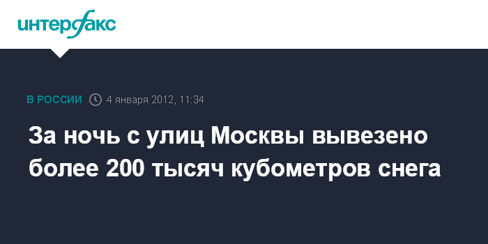 Москва. 4 января. INTERFAX.RU - С начала снегопада, который обрушился на Москву около 16:00 вторника, в городе выпало около 10 см снега, сообщил "Интерфаксу" в среду заместитель мэра столицы по вопросам ЖКХ и благоустройства Петр Бирюков. "Дорожные службы работали слаженно, в полном объеме выполнили работы по уборке улично-дорожной сети города. За ночь на снегосплавные пункты столицы было вывезено более 200 тыс. кубометров снега", - рассказал П.Бирюков.